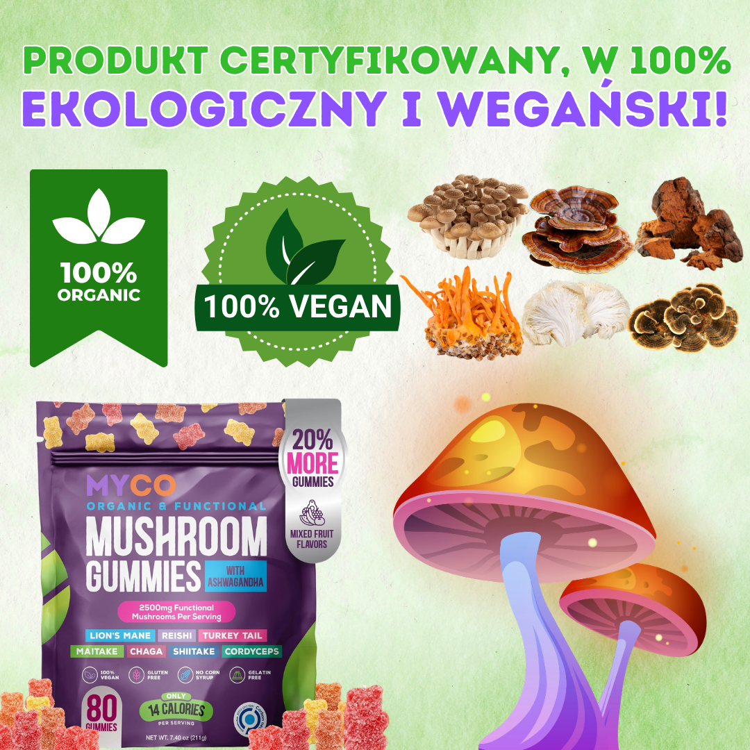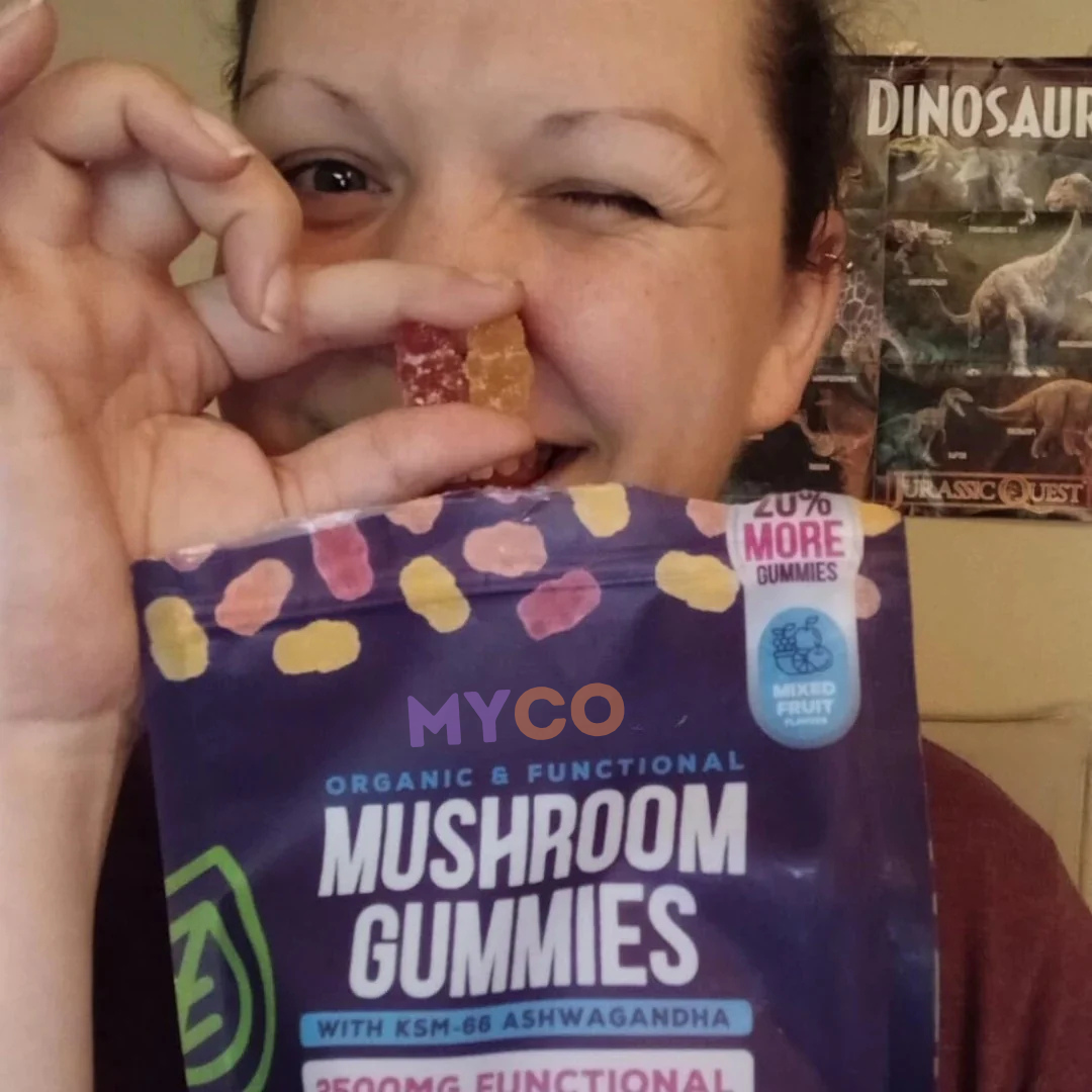 Każda żelka Myco zawiera mieszankę chagi, maitake, grzyba tureckiego, shiitake, reishi, cordyceps, lwiej grzywy i KSM-66 ashwagandha, które zapewniają mnóstwo korzyści.